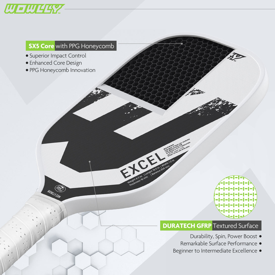 WOWLLY EXCEL series pickleball paddles feature a DURATECH GFRP textured surface for exceptional spin and power. The SX5 core, with 2.3mm thicker PPG honeycomb, enhances control and forgiveness for players at all levels.