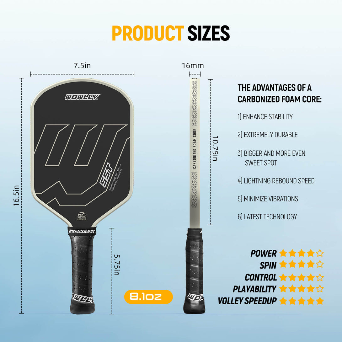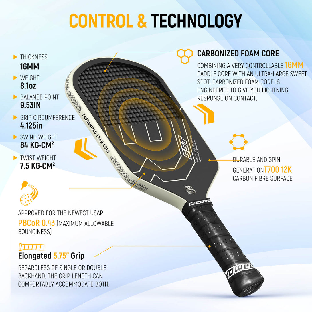 Experience the most advanced paddle core technology on the market. Our breakthrough carbonized foam delivers unmatched consistency and lightning-fast response, adapting perfectly to your playing style from net to baseline.